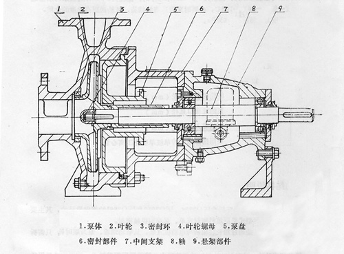 IH系列單級單吸熱水離心泵,是根據(jù)國際標(biāo)準(zhǔn)ISO2858、ISO3069、ISO3661所規(guī)定的額定性能和尺寸設(shè)計(jì)的,其主要零、部件有:泵體、泵蓋、葉輪、軸、軸套和懸架部件等。