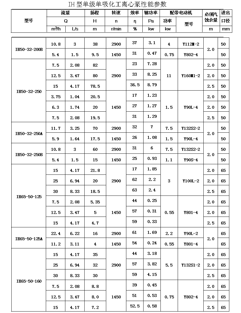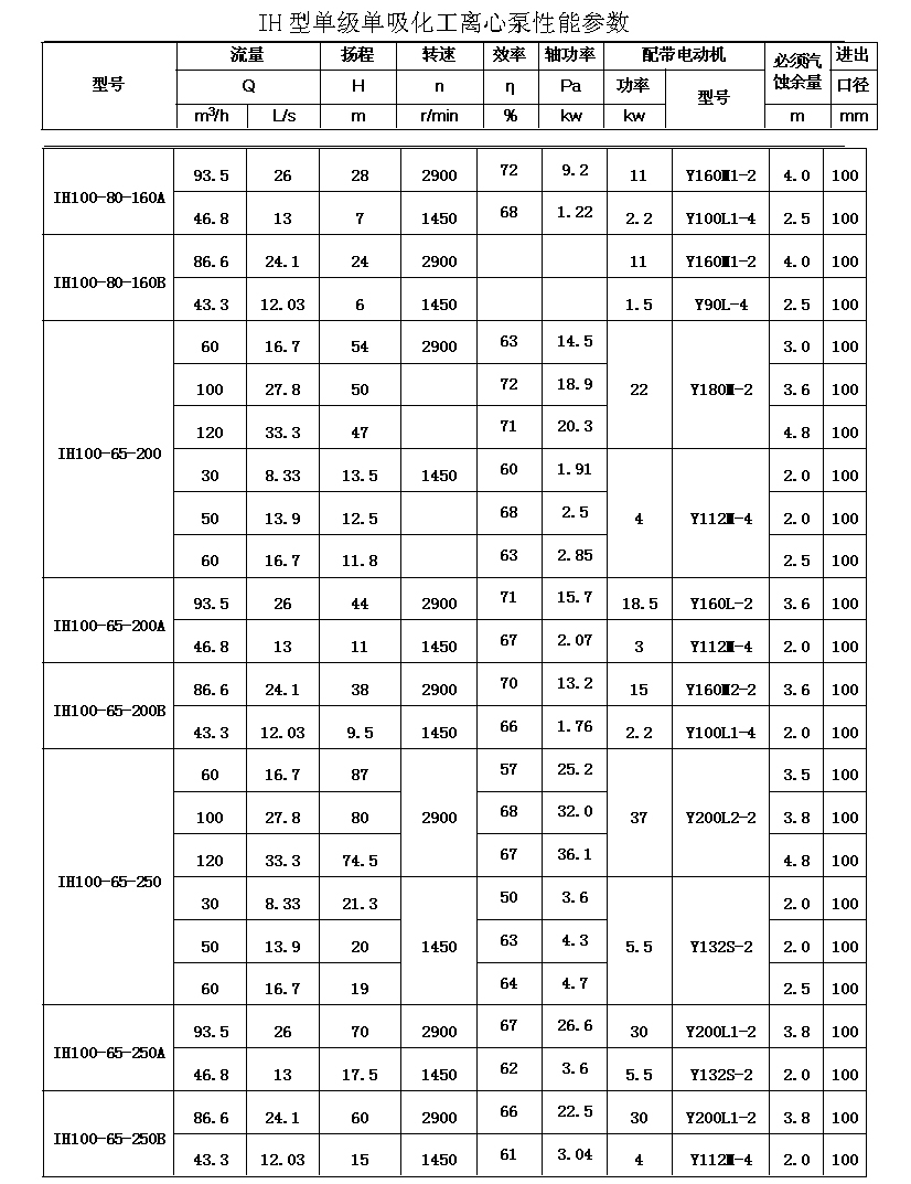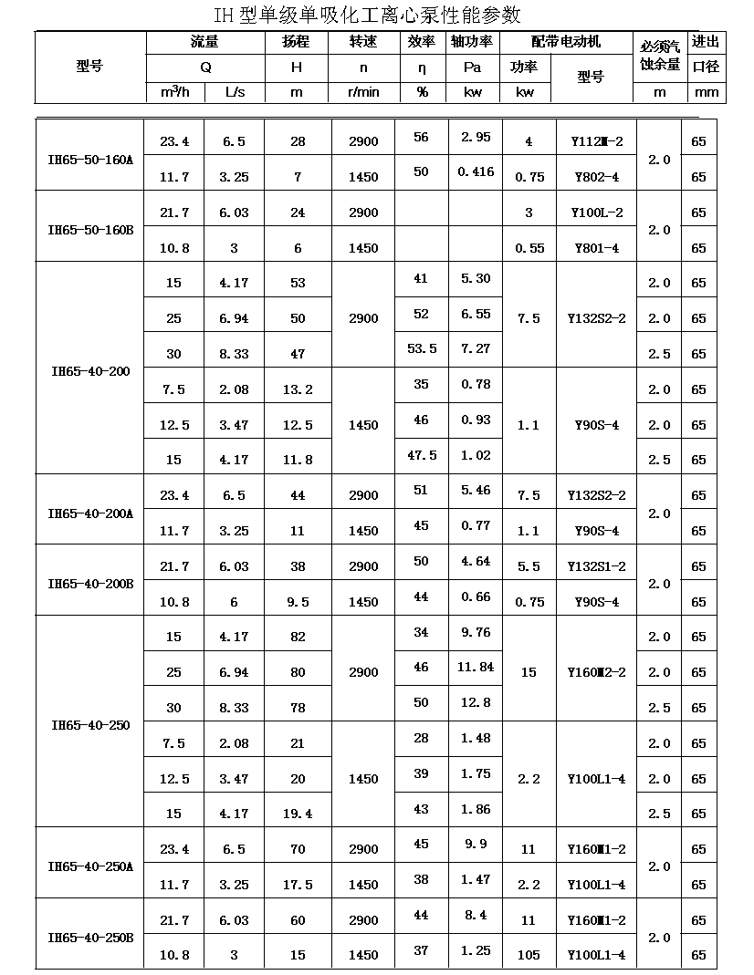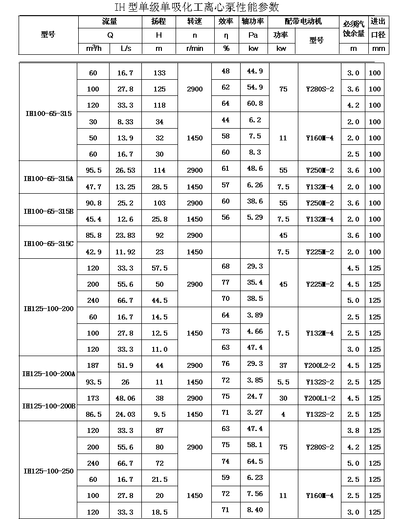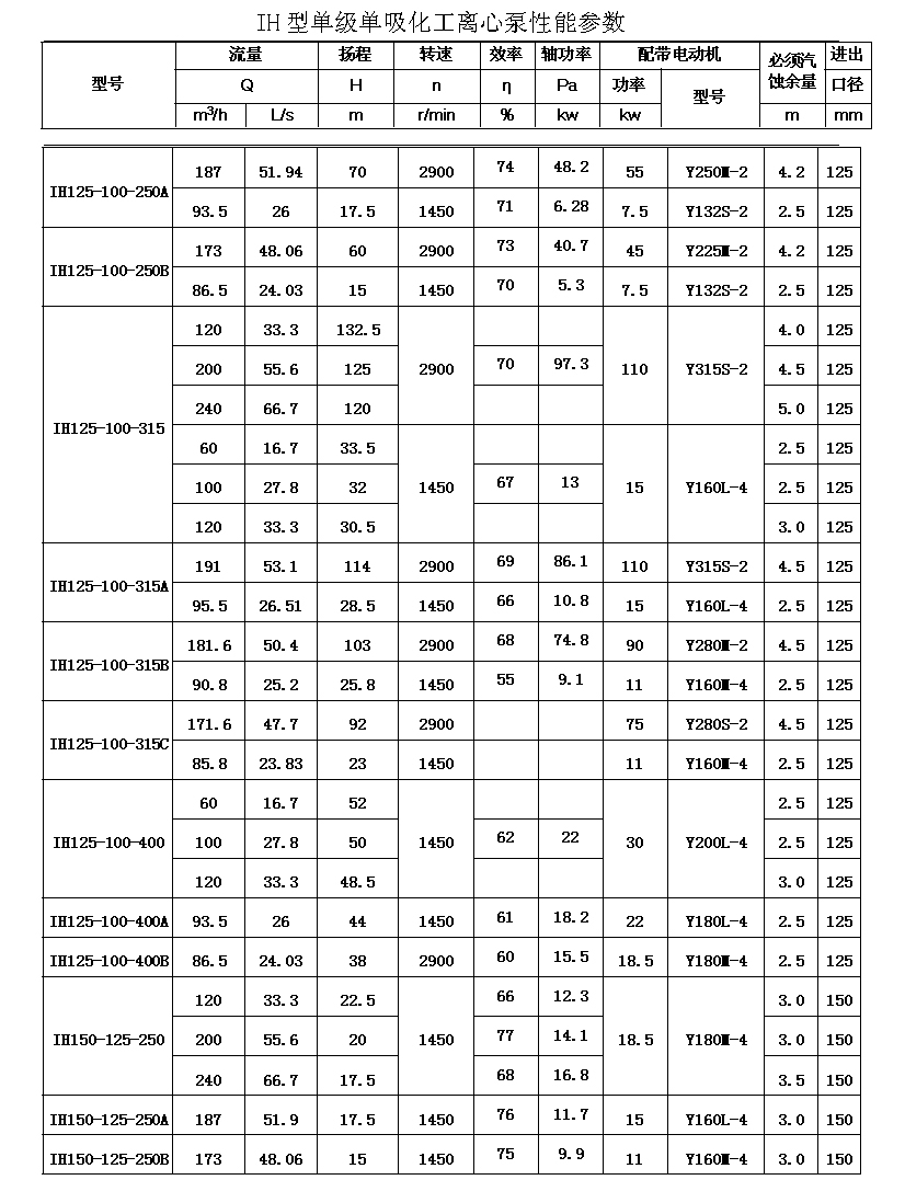 IH系列泵的性能參數(shù)為:流量為6.3~400米3/小時(shí),揚(yáng)程為5~125米。該系列泵輸送介質(zhì)的溫度一般為-20℃和105℃,必要時(shí)采取適當(dāng)?shù)拇胧奢斔透邷囟鹊慕橘|(zhì)泵出口的***高壓力不得超過1。6Mpa。