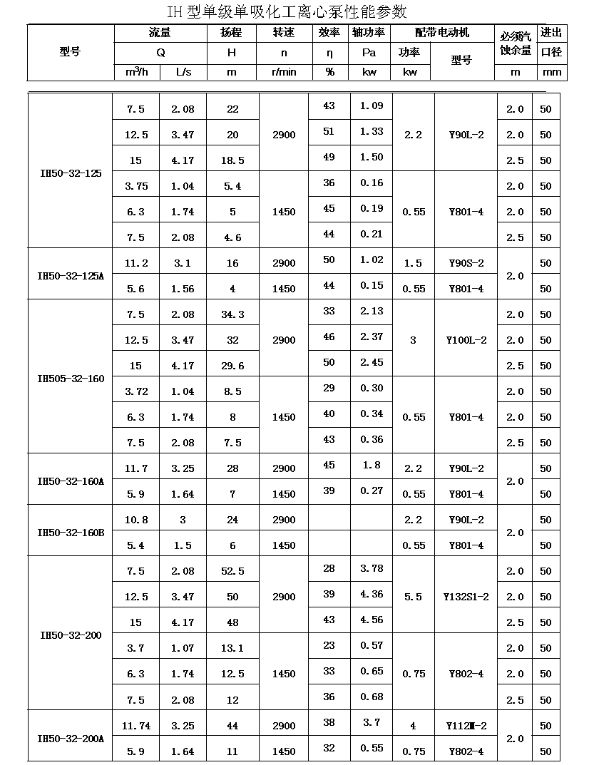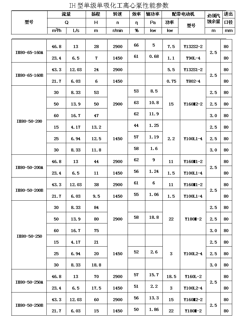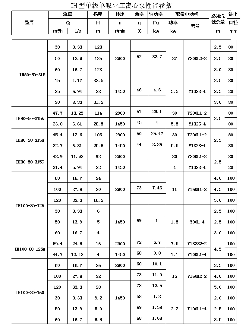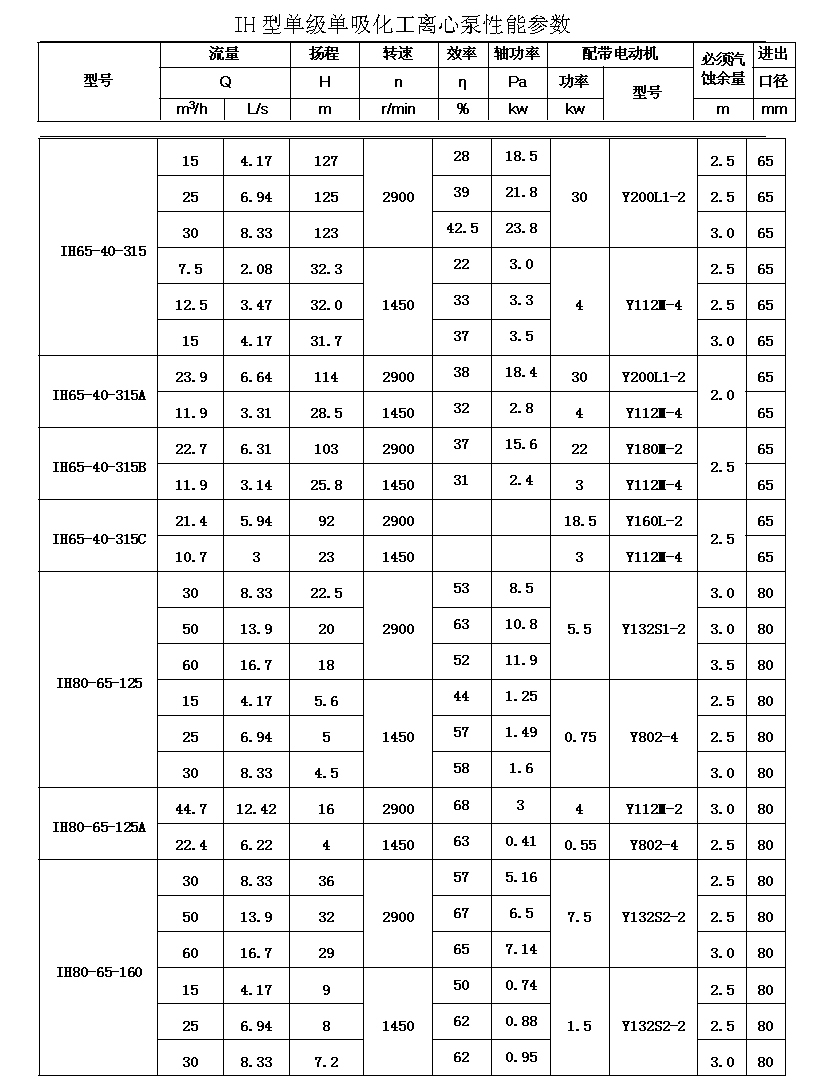 IH系列泵的性能參數(shù)為:流量為6.3~400米3/小時(shí),揚(yáng)程為5~125米。該系列泵輸送介質(zhì)的溫度一般為-20℃和105℃,必要時(shí)采取適當(dāng)?shù)拇胧奢斔透邷囟鹊慕橘|(zhì)泵出口的***高壓力不得超過1。6Mpa。